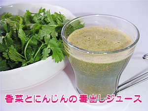 9月7日(月) 香菜ジュースでデトックス アメリカでは、シラントロと呼ばれている香菜(パクチー)が水銀のデトックスにいいと聞いて、さっそく買ってくる。ニンジンとミキサーにかけてジュースにしてみた。 …が飲みづらい。椎茸と出汁を入れたスープに香菜を浮かべてデトックス・スープにしたらこれは美味しい♪