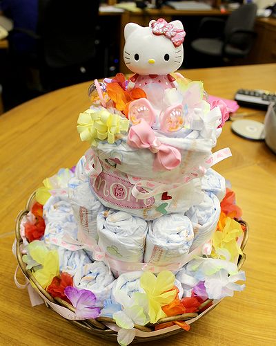 赤ちゃんがいれば、絶対必要なおむつ。こんなカワイイ形にして贈れば、きっと喜ばれるはずですよね。今回のケーキで使ったおむつは30個ほどで、あまったおむつはこのケーキと一緒にプレゼントしました!