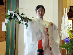 ■お宮の中で神道の儀式に参加 最後に一人一人の名前が呼ばれて、榊を神様にささげる、玉串拝礼の儀が行われました。私の名前が呼ばれて立ち上がります。転ばないようにしないと…。榊を手に取り一礼。神棚の前で二礼。4回手をたたいてお祈りします。その後深く一礼。どうやら無事に終えることができました。ホッ。 |