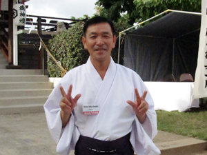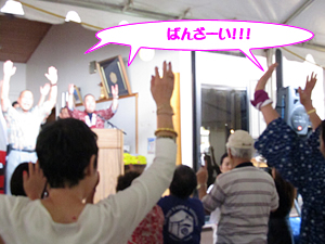 ■皆で力強く万歳三唱 神道の儀式が終わったら、会場を境内に張られたテントに移して楽しいお祭りの時間。まずは今年の東日本大震災で犠牲になられた方々を悼み黙祷をささげます。続いて天野大也宮司による挨拶、出雲大社理事会代表のフレッド・ミウラ氏の挨拶、エグゼクティブ・ディレクターのリチャード宮王氏の挨拶、来賓の紹介と挨拶などが行われました。続いて大江戸睦の渡辺会長と、ロナルド森川氏による万歳三唱。皆で力いっぱい「ばんざ~い!」と両手を振り上げます。その後、紅白のお餅がステージから客席にまかれました。これが結構コワイ。カメラを構えている私は、頭に当たらないかドキドキ、ドッジボール気分でした。 さあ、次はお待ちかねのご飯の時間です。 |