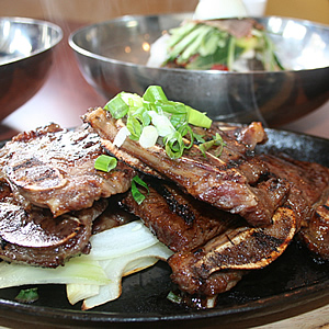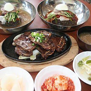 次に紹介するのが、葛冷麺と人気を2分する葛ビビン冷麺($9.99)。激辛好みの人にオススメで、葛冷麺と同じ具の上に、スープの代わりの真っ赤なヤンニョム(合わせ調味料)がのってます。ビビンバの要領で全部を豪快に混ぜて食べるのが韓国風。ナムルの水キムチが箸休めにぴったりの程よい辛さが、暑いハワイではすごくうれしい一品。 ここでちょっと冷麺の歴史をひも解いてみると、スープの入った冷麺(ムルネンミョン)の発祥の地は平壌、ヤンニョム入りの冷麺(ビビンネンミョン)は威興だそう。ムルネンミョンはそば粉や緑豆粉から作った粘り気の少ない麺が多く、ビビンネンミョンはジャガイモやサツマイモを使ったでんぷんの多い麺が特徴。ユッチャンで使っている葛は薬膳の一種として、解熱、胃腸病、二日酔い、肌の改善などに効くとされているから、どうりで一杯ペロリと食べてもお腹にもたれないはず。体にも優しい冷麺だから、これはますますファンになりそう! |