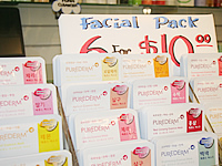 | ■毎日のお手入れが肝心 「韓国ではエステも盛んだし、食事にも薬膳の考え方が浸透してるから、毎日の食事とお手入れが美肌に結びついてるんじゃないかしら」とソニアちゃん。俳優さんにも美しい肌と鍛えられた肉体が要求されるから、皮膚科やジムに通うのは当たり前と聞きます。サンウ様、ビョン様… そういえば確かにみんなオキレイ… (笑)。「あっ、このシートマスクも安くて効果大よ」と最後に見つけてくれたシートパックは、高麗人参、コラーゲンなど、よりどりみどりで6枚たった$10! こういった商品を上手に使って毎日のお手入れを楽しむのが韓国女性の美肌の秘訣かも。奥が深〜いコリアナ化粧品で、アナタもチェ・ジウに変身してみませんか?