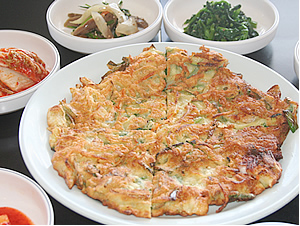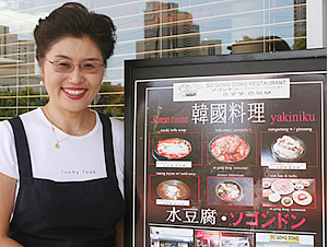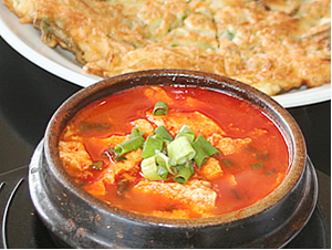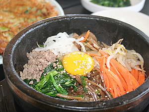 | ■イチ押しメニューはチヂミとビビンバ ソニア:スンドゥブだけでお腹いっぱいになっちゃうけど、大勢で繰り出してる場合は他のものもつまみたいでしょ。そんな時は何と言ってもチヂミ。特にシーフード・コンビネーションがイケるわよ! スタッフ:お好み焼きみたいでホッとする味。しょう油とコチュジャンをつけると、よりおいしいね。 店員さん:うちの石焼ビビンバもとっても評判がいいんですよ。どうぞ召し上がってください。 ソニア:うれし〜、どんどん食べちゃおっと。ビビンバはとにかくよくかき混ぜて食べてね。韓国料理は味が複雑に混じりあうところに醍醐味があるから。つまり英語でいえば、ハーモニーってとこかしら(爆)? |
