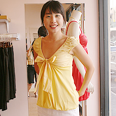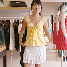 | ■韓国系セレクトショップでおしゃれ三昧 ソニア:ねぇ、まだお茶には早いから、少しお洋服でも見ていこうよ〜。ピーチズ&ドリームっていうかわいいセレクトショップがあるのよ。(と言いつつ、もう既にドアを押しているソニア….笑) 店員さん:オノオセヨ(いらっしゃい)! アリシアです、よろしく。 ソニア:キャ〜、かわいいのがいっぱい。目移りしちゃう〜! アリシア:気に入っていただけました? ピーチズ&ドリームには、流行のガーリーなワンピが続々入荷中なので、どんどん試着してみてね。お値段もお手頃なの。あと人気ブランドのチャイニーズ・ランドリーのサンダルも取り揃えてるので、トータルでコーディネイトしてみて。 ソニア:わ〜い、うれしい! さっそくソニアのファッションショーを始めちゃおっと(笑)。 |