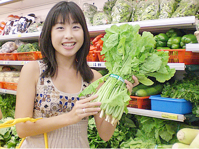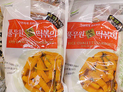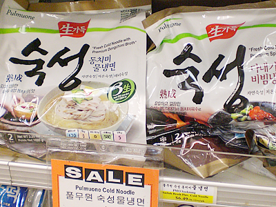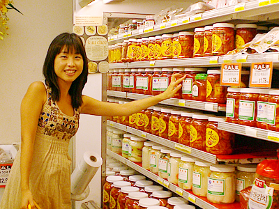 ソニア:まずは入口付近の生鮮野菜から案内するわね。大手米国系スーパーに比べて格安と評判の野菜類。 中でも珍しいのが、韓国料理の食材として欠かせないごまの葉($1.99/lb.)や韓国瓜 ($1.39/lb.)。どう、新鮮でしょ? 野菜コーナーの後は、ズラリと奥までパック食品が並んでいるんだけど、ここにもおいしいものがたくさんあるの。まずはこの大根のなます。わさび、マスタード、酢と3種類の味付けがあって、どれも付け合せに最高($3.99)。他にも韓国冷麺($3.99)や、前回の取材でも堪能したトッポッキ($3.99)などがずらり。中でも「プルムワン」の冷麺はソニアのお薦めよ。スープもクリアとコチュジャン入りの2種類あって、ホントおいしいんだから! 他には珍しいチューブ入りの水豆腐($1.99)も。これはスンドゥブ用で、インスタントのスンドゥブの素($1.59)もあるから、お家で気軽にスンドゥブが作れちゃう。 |