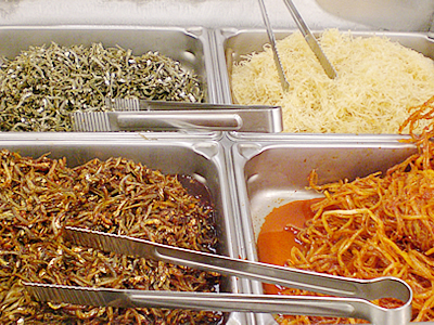 煮物8種/煮豆、ゴマの芽、テグ(海草)、いか、かに、いかとたこ、牡蠣、たらこ($7.99〜12.99/lb.) ナムル12種/ごまめ2種類、いか2種類、かに、にんにくの芽、黒豆、きゅうりの古漬け、シーフードミックス、海鮮サラダ、干し大根、しし唐($5.99〜15.99/lb.) 前菜4種/白菜キムチ、きゅうりのキムチ、どんぐりのこんにゃくの和え物、しし唐の煮付け($3.99〜9.99/lb.) スープ3種/キムチスープ、豆腐スープ、わかめスープ($3.00/lb.) ソニア:ここでは、好きなものを必要な量だけプラスチック容器に盛って、レジへ持っていっていくだけ。セルフサービスだから言葉の心配もなく、誰でも気軽に利用できるはずよ。 |