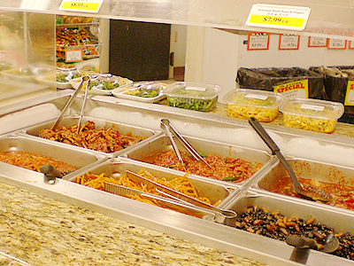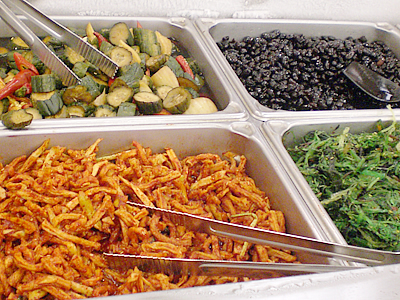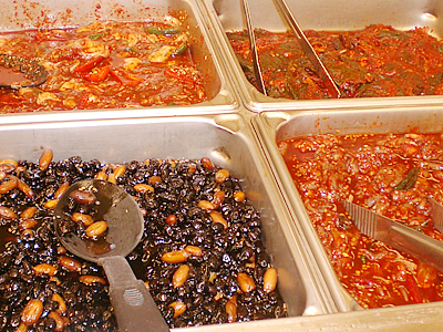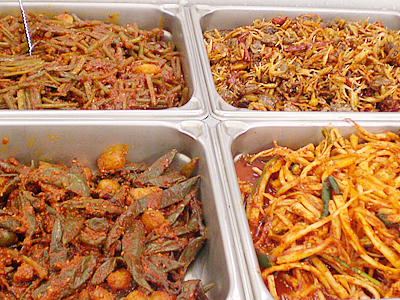 ■大人気! 本場仕込のお惣菜バイキング ソニア:次にご案内するのが、本場仕込のお惣菜がテイクアウトできるお惣菜売場。バラエティ豊かなメニューは、スープ3種、ナムル12種など選りどりみどり。どれも野菜たっぷりでヘルシー、おまけに安い! そんな訳でローカルに大人気のお惣菜だけど、実はツーリストにもお薦め。食生活が乱れがちな旅行中に、安くてヘルシーなテイクアウトが出来るとあっては、利用しない手はないでしょ?! じゃ、気になるお惣菜の内容を一挙に大公開しま〜す!