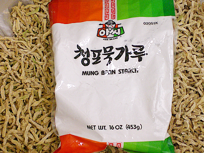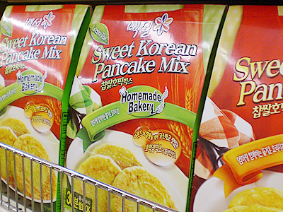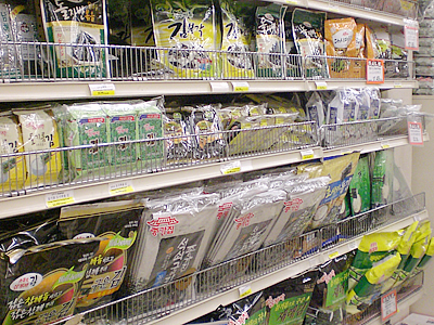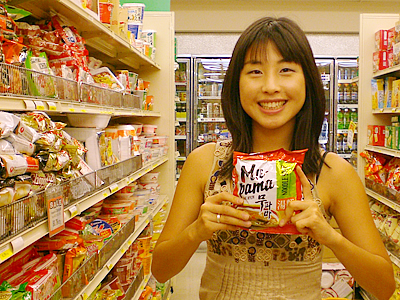 ソニア:ストア中央にはパッケージフードが陳列されているんだけど、何はともあれまず韓国海苔から紹介するわ! 寿司海苔から味付け海苔まで、たくさんの種類が出回っているんだけど、この緑茶味の海苔($7.89)はどう? 珍しいでしょ? スタッフ:確かにグリーンティー・フレーバーって書いてある… オッ、緑茶味とレギュラーのコンビも同じ値段で発見! これは日本でも見たことないわね。 ソニア:韓国ではちょっとした緑茶ブームなんだけど、珍しいといえばホラ、緑茶味のホットケーキ($4.89)まで! これにはわたしもちょっと驚き(笑)。他にもナムルとしておなじみの「どんぐりのこんにゃく」を作る粉も売ってるわよ。英語ではMung Bean Starchというんだけど、これも韓国の薬膳としてよく知られてる食材なの。あとは乾物を代表する麺類も見逃せないわね。カップ麺は本当に種類がたくさんあって困るほどあるの。 スタッフ:日本でも辛ラーメンがブームになったことがあるものね。 ソニア:その辛ラーメンは当然のこととして、注目してほしいのが韓国人の大好物ジャージャー麺($1.29)やタン麺($0.89)のインスタント。辛ラーメンよりこっちの方が韓国では定番かも。ハワイでも手に入るからとっても助かってま〜す(笑)。