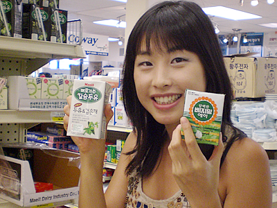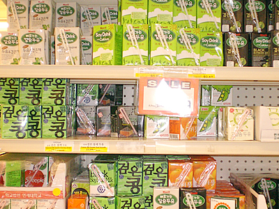 ソニア:最後の棚にはペットボトルや紙パック入りのドリンクがずらり。ドリンク類はわたしも本当によく購入してるの。健康的でしかもお安いの。韓国の女の子がよくのむのが、ジャスミンティーや菊の花びらのティー。ノンカロリーが人気の秘密ね。ブルーやイエローのボトルのデザインもかわいいし、コンビニでも必ず売ってる人気ドリンクよ。あとは、とうもろこしのお茶やシッケ(韓国料理の最後に出てくるご飯粒入りの甘いお茶)まで、ペットボトルや缶になって売ってるからホントに便利。 スタッフ:このドリンクコーナーの端の棚にずらりと並んでる紙パックドリンクは何? ソニア:きゃ〜懐かしい! これ豆乳の紙パックなんだけど、ごま味や黒豆味があってすっごくおいしいの($0.59)。おじいちゃんの家に行くと必ず買い置きがあって、いつもよく飲まされたものよ。この紙パックを見ると、おじいちゃんを思い出しちゃう〜(笑)。 スタッフ:これマジで安いよね?! 豆乳とも相性抜群のフレーバーっぽいし、これは絶対買いアイテム! お買い物の最後になんだかとっても得した気分です!