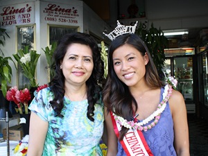 ■高祖父さんが中国からハワイ島へ移住 素敵な二コールさんが歩くと、沿道がざわざわ。知性と美を兼ね備えたミス・チャイナタウンになることは、大変な名誉なのです。チャイナタウン・カルチュラル・プラザを出て、その南に広がるチャイナタウンを歩きましょう。チャイナタウンにはレイのお店がたくさん。とあるお店で、二コールさんは素敵なレイをプレゼントしてもらいました。ハワイのアロハ・スピリットあふれるレイのプレゼントににっこりする二コールさん。レイのお店のオーナーさんと記念にパチリ。 |