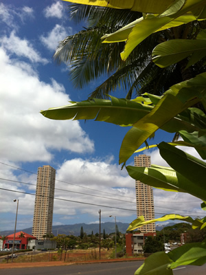 さて、私の住んでいる、ツインタワーと呼ばれるこの建物。日本からハワイに飛行機で来た時に、オアフ島に着陸する際に、ものすごい高い2つのタワーを見た事はありませんか? そこにココは住んでいます! はい、ここがパールシティーのエリアです! この私が住んでいるツインタワーのいいところは、窓が西の方を向いているので、毎日最高なサンセットを家から見る事が出来ます。でも、でも、だめなところは、西日が強すぎて、午後の4時以降は、クーラーが必須なんです…(笑)。
