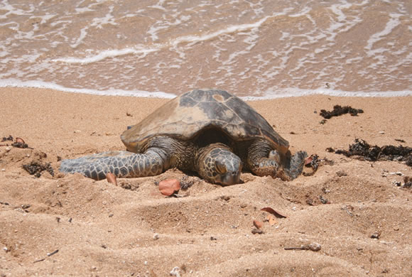さて、この大亀さん。ここハワイでは、幸運のシンボルとされていて、亀のタトゥーをしている人もよく見かけます。ハワイ州では、このシータートルを保護していて、決められた距離よりも近づいたり、餌をあげでもだめ、ましてや、触ってもだめ、乗ってもダメ、罰金が科されます。2年前に、ノースショアーでプロサーファーが、この大亀さんに乗っている写真がインターネットで流れて、問題になっていましたね。最高で、なんと、$13,200(132万円?)の罰金が科されると、ローカルニュースでやっていました。 大亀の他に、モンクシールというアザラシ(?)のようなのも、 たまに海でみかけることがありますが、こちらもハワイ州で保護されています。幸運なこのシータートル、できれば触って幸運をわけていただきたいところですが、これまた結構強暴らしく、噛んだりしてくるそうですので、気をつけて下さいね(笑)。