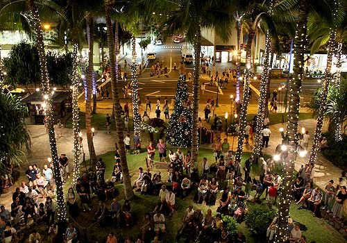 中庭のロイヤルグローブのヤシの木にもライトアップが施され、カラカウア通りに面したところにはツリーと