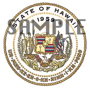 ハワイ州の紋章は2重の輪の中に模様が入っているもので、この輪の中には上の部分にSTATE OF HAWAIIという州の名が入り、下の部分には、ハワイ語で州のモットーである「UA MAU KE EA O KA AINA I KA PONO(大地の生命は正義によって保持される)」と書かれています。