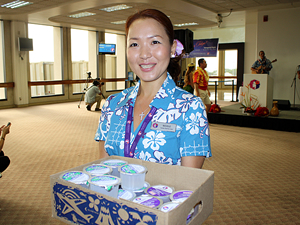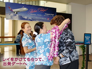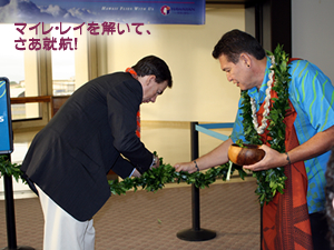 日本舞踊の披露の後は、ハワイアンのカフ(司祭)、ケオニ・ヌネス師によるブレッシング(ご祈祷)の儀式。ダンカリー社長とともに、マイレ・レイをほどき、いよいよ飛行機に乗り込みます。ハワイアン航空の社員が、ハワイらしさいっぱいのオーキッドのレイを人々の首にかけてくれ、ボルテージは最高に。