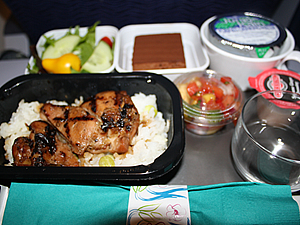 機内誌、Hana Hou(ハナホウ、ハワイ語でアンコールの意味)には日本語版もあります。パラパラとめくっていたら、なにやら良い香りが。待ってました! ディナーの時間。ハワイアン航空の機内食は、すご腕シェフ、チャイ・チャオワサリー氏によるもの。ディナーのメニューは、ビッグ・アイランド産オーガニック野菜のサラダ、ハワイアン・スタイルのバーベキュー・チキン(マンゴーとベリーのサルサとライス添え)、そしてハワイアン・チョコレート・デカデント・ケーキ。どれもとても美味しく、幸せな気分に。シャキシャキのサラダも、ピリカラのチキンも、そして甘すぎない上品なケーキも、今までの機内食のイメージを覆す、新鮮なお味。もう美味しーっ!