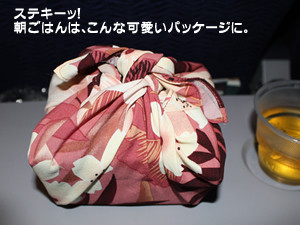 ぐっすりと眠って目覚めると、朝ごはんの時間! なにやら可愛いパッケージが登場しました。朝ごはんを包む花柄のハンカチは、マノアDNAのファミリーが経営することでも良く知られるアロハシャツの老舗、「イオラニ・スポーツウェア」によるもの。これはお土産に持ち帰ることができますよ。パッケージの中には、ターキーラップ(トルティーヤで巻いたサンドイッチ)、クララ・コンフェクショナーズのパイナップル・クッキー、そしてマカダミア・ナッツ・チョコレートが入っています。美味しいし可愛いし、もう大満足! さあ、いよいよ羽田に到着です。