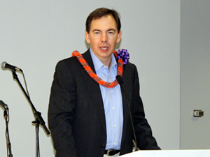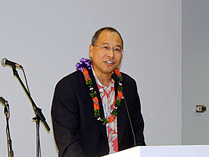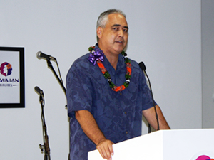 私たちもカメラとビデオで撮影! ゲートの様子を撮っていると、セレモニーがはじまりました。まずは、ハワイアン航空プロダクト開発部門ヴァイスプレジデント、ブレイン・ミヤサト氏が登場。就航への思いを語ります。続いて登場したのは、ハワイアン航空のプレジデント兼CEOのマーク・ダンカリー氏です。日本就航へ向け努力してきたチームの努力をねぎらうとともに、日本便への静かな自信が感じられるスピーチに、大きな拍手が巻き起こりました。続いてハワイ・ツーリズム・オーソリティのプレジデント兼CEO、マイク・マッカートニー氏と、ハワイ日本文化センターのチェアマン、カート・オオタグロ氏が祝福の言葉を贈りました。