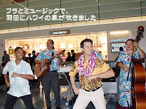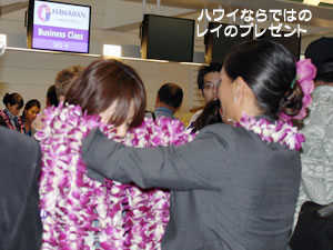 ●今度は羽田からハワイへ 19日(金)の午後11時59分。いよいよ、ハワイへの初フライトです。羽田空港のチェックイン・カウンターには長蛇の列が。新しい国際線ビルはどこもピカピカで、綺麗です。ハワイアン航空のカウンターにはハワイのお花がたくさん飾られ、ここでもハワイアン航空の職員の人々にオーキッドのレイをかけていただきました。レイっていいですよねー。 チェックイン・カウンター脇では、セレネーダーズがハワイアン音楽を演奏。ダンサー達が本場のフラを披露します。チェックインカウンターから、出国検査へ。出発ゲートへは、動く歩道を乗り継いで向かいます。動く歩道って、降りる時に注意しないとつんのめってしまいそう。注意、注意っと。 ●乗った瞬間ハワイのムード