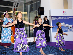 出発ゲートでもセレモニーが行われました。セレネーダーズの演奏で4人の可愛いケイキ(子ども)・フラ・ダンサーが元気いっぱいにフラを披露します。マーク・ダンカリー氏の力強い挨拶、カフのブレッシングが行われ、ホノルルと同じく、羽田空港のゲートでも、マイレ・レイが解かれました。さあ、これで安心。いよいよ出発です。 「アロハ」 顔いっぱいの美しい笑顔に迎えられて機内へ。さっそく席に着くと、アイマスクと耳栓の入ったパッケージが配られました。静かに眠りたい人には何よりのサービスですね。チェックイン・カウンターで配られたステッカーも便利です。「起こさないで下さい」、「免税品販売の際は起こしてください」、「食事サービスの際は起こしてください」と、3色のステッカーがもらえますので、状況に応じて目立つところに貼ることができます。何も食べずにずっと寝ていたい人などには、とても嬉しいサービスですよね。