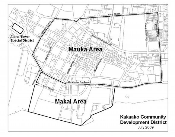 カカアコ地区はハワイ州によって特別開発地域に指定されており、再開発計画は州機構のハワイ・コミュニティ開発オーソリティ(HCDA)の管轄下、土地を所有する州、カメハメハスクール財団、大手デベロッパーのハワード・ヒューズ社などによって進められています。(マップ=HCDA提供)