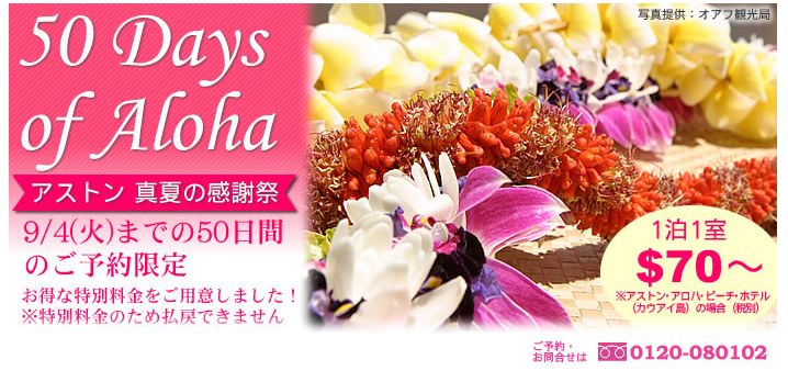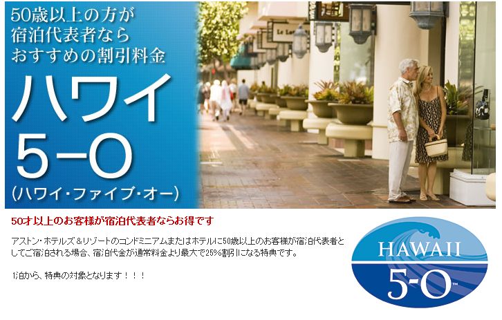 ハワイ4島に25のコンドミニアムとホテルを運営するアストン・ホテルズ&リゾーツで、50才以上の方が宿泊料金を最大25%OFFで申し込めるプラン「ハワイ5-O(ハワイ・ファイブ・オー)」を行っています。 宿泊代表者が50才以上の方であれば、このプランに申し込むことが可能で、「アストン・アットザ・ワイキキ・バニアン」「アストン・ワイキキ・ビーチ・タワー」などのワイキキ内の複数のコンドミニアムが対象です。 また「アストン 真夏の感謝祭」と題して、1泊1室$70からのお得な特別料金での申し込みも現在受付中。こちらは9月4日(火)までです。お得にハワイ旅行を計画するチャンスです。どうぞお見逃しなく! ● ハワイ5-O(ハワイ・ファイブ・オー) ● アストン 真夏の感謝祭 |