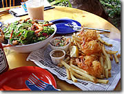 早めにケアウホウの町に着いたので、まだまだ時間はたっぷりあるし、コナの町で昼食を食べることにしました。ババ・ガンプ・シュリンプ・カンパニーで、エビのココナッツ揚げとサラダを食べました。このお店はオーシャン・フロントになっていて、とにかく眺めは抜群です。私はトム・ハンクスが大好きで、映画「フォレスト・ガンプ」は何回も観ました。お店のところどころに映画を思い出させる卓球ラケットや小物などがあって楽しいです。ハワイのお料理の特徴として、量がかなり多いので、1人前ずつ頼んだにもかかわらず、お腹は苦しくなってパンパンになってしまいました。 |