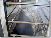 腹ごなしに、もう少し頑張ってワイコロアの町、キングス・ショップまで足を延ばしてみることにしました。やはりちょっと欲張り(?)な我が家です。車で走っていると、沿道の黒い土の上に白い石を置いてメッセージを書いたものがたくさんありましたが、これは観光客が勝手に並べて置いていっているそうです。いかにも日本人が置いていったという感じの、温泉マークもあって笑ってしまいました。 |