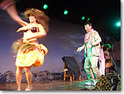 それから、こういうショーでお決まりの、お客さんが舞台でポリネシアン・ダンスをさせられる時間になりましたが… 何と、主人が美しいお姉さんに手を引かれて舞台へと連れて行かれました。踊り方を教わってペアでダンスです。何人かが舞台に上げられ、もう会場は大爆笑の渦です。こんなハワイに来てまで笑いものになっちゃって…、と思いながら私もかなり大笑いしてしまいました。そんなオチつきのショー見物でしたが、本当に見ごたえ充分でお勧めです。 |