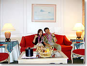 さすがにこのホテルは日本語スタッフもたくさんいる様子です。ウェルカムのレイを首からかけてもらいました。日本語で細かく意思表示ができるのがうれしいです。チェックインは通常、午後3時なのですが、午後2時でも部屋に入れるということで、キーをもらってルンルンで2階のお部屋に向かいました。私たちの泊まった部屋は、歴史ある本館の建物の、たぶんジュニア・スイート・クラスではないかと思います。ダイヤモンド・ヘッドが見える窓側がリビング・ルームになっていて、天井も高く、とても広い作りでした。スペインの古城にでも泊まるような雰囲気。こんな素敵な部屋に泊まらせてもらえて、本当にありがとうございます! |