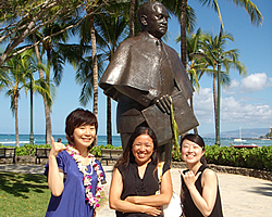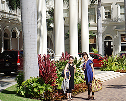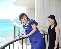 成田ですでにトップギアな2人を乗せ、ユナイテッド機は、快晴のホノルル空港に到着。入国手続を済ませ、初の「個人旅行者用出口」に、2人のテンションも上がります。「ここって、お正月に芸能人が撮られてるところだよね?!」などとはしゃいでいたところで、「ハワイの歩き方」編集部のアキコさんとフミコさんと合流。首からレイをかけていただき、うれしはずかし記念撮影です。 空港の建物を一歩出た途端、そこはかとなく漂うハワイの香り。この香りをかぐたび、ハワイに帰ってきたー! という喜びがこみ上げます。はやる気持ちを抑えつつ、タクシーでワイキキへ。 今回の滞在先である、ホテル「ワイキキビーチ・マリオット・リゾート&スパ」にスーツケースをいったん預け、打ち合せを兼ねて「モアナ・サーフライダー・ウェスティン・リゾート」ザ・ベランダのサンデーブランチへ連れて行っていただきました。窓からの絶景とおいしいビュッフェは、「白い貴婦人」の貫禄もの。幸せすぎて、もう怖いくらいです。 |