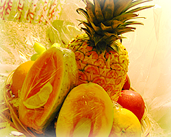 まだまだ物欲はおさまりませんが、今日のところはひとまず、ということで午後8時、ホテルへ。お部屋で、テイクアウトしたヤミーコリアンBBQ(ミニBBQチキン、$6.75)の夕食を取っていると、突然のノック。驚いてドアを開けると、ホテルの方が大きなフルーツの盛り合わせをかかえてずんずん入ってくるではありませんか。「え? 注文してませんけど??」と焦る私たちに差し出されたのは、1通の白い封筒。目を通してみると、そこには、滞在先のホテル「ワイキキビーチ・マリオット・リゾート&スパ」側から今回の懸賞当選をお祝いするメッセージが。豪華なウェルカムフルーツも、ホテルからのプレゼントのこと。「きゃーっ、こんな幸せ、よいのですか〜」。またまた大興奮のうちに、初日の夜は更けてゆきました。 |