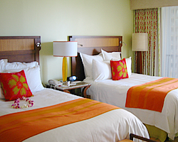 ワイキキビーチ・マリオット・リゾート&スパそして「ワイキキビーチ・マリオット・リゾート&スパ」へ戻ってチェックイン。青い空をくりぬいた吹き抜けには、燦々と夏の日差しがふりそそぎ、エントランス中央に作られた滝が気持ちのいい水音をたてます。パームツリーやブーゲンビリヤの花々があふれるロビーを通り抜けて、お待ちかねのお部屋へ。ケアロヒラニ・タワー17階の部屋に足を踏み入れた瞬間、私たちの目に飛び込んできたのは、きらめくコバルトブルーの海!! 一目散にラナイへと駆け出し、思いっきり身を乗り出します。 目が沁みるような、碧い海。吸い込まれそうな水平線。オーシャンビューから臨む太平洋の碧さ、広さは、言葉に尽くせない素晴らしさで、思わず大きな声で叫びだしそうになりました。 ひとしきりはしゃいだのち、アキコさん・フミコさんとはお別れ。一息つく間もなく、お部屋探検です。オレンジと白を基調としたインテリアは、南国ムード満点。バスルームは、洗面フロアとバスタブ・トイレフロアがドアで仕切られているので、1人がバスタブやトイレを使用していても、もう1人は洗面台でメイクなどが可能です。これは、女子にはうれしい構造。バスタブのシャワーヘッドも可動式で、大満足です。 てきぱきと荷解きをするタカハシさんを横目に、時差ボケぎみの私は、ふかふかベッドへダイブ。白いレースのカーテンを揺らして入ってくる気持ちのいい風に、ついついまどろみそうになります。このまま極上の午睡へと突入したいーーところではありますが、ハワイが私たちを待っている! 飛び起きると、さっそく、今日までセール中のアラモアナセンターへと繰り出しました。JCBカード提示で無料乗車できる、トロリーピンクラインを使用です。