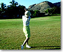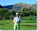 この日はとっても楽しみにしていたゴルフの日です。ハワイの歩き方のスタッフの方におすすめのゴルフ場を教えていただき、ハワイカイ・ゴルフコースへ行きました。ワイキキから西へ30分。車で走るとダイヤモンドヘッドを通り、そのあと海側を走るので景色が抜群です。ゴルフ場は平日ともあり二人でまわることができました。今回はキャディバッグを持参しました。今は自宅から成田空港まで宅配便があるので、あまり重い思いをすることがなく持ってこられるので便利です。