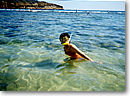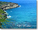 その後は、帰り道ゴルフ場から8キロぐらいのところのハナウマベイに行きました。以前ドライブで来たことがあったのですが、きれいな海は是非入ってみたいと思い、今回はシュノーケルと水中メガネを持参で水着を持っていきました。ここの海は本当にきれいで、波も静かで、魚がいっぱいいます。膝のところまで入ると、黄色と黒の縞模様の魚に出会い大感激! 青やオレンジ色のきれいな魚がたくさんいて、二人で夢中になって魚と遊んでいました。