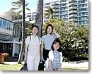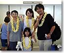 定刻通り、ホノルル到着。空港内に一歩踏み出すと、一気にハワイの香りに包み込まれる様な気がするのは、私だけかしら? イミグレは長蛇の列で30分以上もかかってしまいました。個人出口を出ると、そこには「森谷様」のカードを持ったスタッフのUさんを発見! うおっ! この方があのサイトを作っていらっしゃるのねぇ〜と密かに感動! Uさんからレイをかけていただき、大満足の森谷一家です。