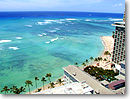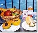 今日も良いお天気です。ラナイに出て、昨日ホテルの部屋に戻ったらハイアット・リジェンシーからプレゼントのフルーツバスケットが届いていました。さっそくいただいたフルーツとABCストアで買っておいたデニッシュや牛乳で朝食にします。切りたてのパパイヤの瑞々しくて美味しいこと! 視界一面に広がる美しい海もまた特別の御馳走でした。