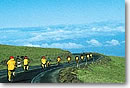 ひょうたん型をしたマウイ島、その東部分中央にそびえるハレアカラは、標高3.055メートルの高山。冬場には雪をいただくこともある休火山です。とはいえ、きれいに舗装されたハイウェイが山頂まで通っていて、旅行者でも気軽に訪れることができます。このハレアカラ山頂はハワイきってのサンライズの名所として知られ、毎日夜明け前にはこの朝日を見に訪れる旅行者のレンタカーや観光バスで、駐車場がいっぱいになるほど。この天をつく高山の天辺から海岸まで、自転車で約60キロの距離をひたすらにかけ降りてくるというシンプルなダウンヒル、でもそれなりに体力も必要で、アドベンチャー気分が味わえるツアーなのです。