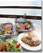 ●食事は海を眺めながら! そろそろ、お腹がすいていませんか? そういう方にオススメしたいのが店名の通り、おいしいチーズバーガーで知られる、陽気な雰囲気の「チーズバーガー・イン・パラダイス」本店。遠くにラナイ島の島影を仰ぎ、海を眺めながら食事を楽しめる海側の席が特等席です。焼きたてのパテに、生でも食べられる甘くて新鮮なマウイ・オニオンをはじめ、トマトなどの野菜もたっぷりのハンバーガーはボリューム満点。床は木造で、天井には映画に登場しそうな大型ファンが回り、夕方からは生バンドの演奏もあるので、食事しながらのんびり楽しんでくださいね。 |