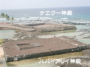 この場所は、ハパイアリイ・へイアウ、ケエクー・へイアウ、カプアノニ・へイアウという3つの神殿が集中する聖地でもありました。通常、ハワイアンの間では古代の神殿跡にある石を動かしたりしてはならない、という暗黙の掟があるそうですが、ここでは、カメハメハ財団によるハワイ州内でも珍しい神殿の復元作業が行われています。2009年8月現在で既に付近にある7つの神殿が復元されているとのこと。古代ハワイアンの神殿には、それぞれ役割があり、ケアウホウ・ビーチ・リゾート海側のすぐ左手にあるハパイアリイ・へイアウは1400年代に建設された祈りの神殿であったと言われています。この神殿の近くに行くと、とても清々しい空気が流れていて、天に届くような祈りが捧げられていた場所という印象があります。この神殿の再構築作業は、2007年に終了しています。 |