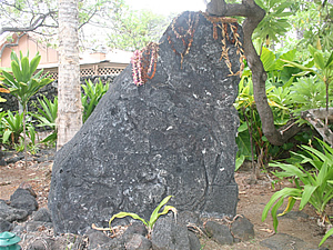 ケアウホウ・ビーチ・リゾートのプールのすぐ前にあるカプアノニ・へイアウは、豊穣の神殿であったといわれており、こちらの神殿はこれから再建される予定だそうです。この神殿の周辺には、その他にも古代ハワイアンが大切にした王族ゆかりの史跡があります。豊漁の神に捧げたウルパラクア・ストーンというヒーリング・ストーンがあり、これはウミガメの頭のような形をしており、釣り針の形が刻まれています。そのすぐ側にはポオ・ハワイ・ポンドというハワイの王族が使った池とカラカウア王のサマーハウスのレプリカがあります。建造物は再現されたものですが、もとのサマーハウスの場所には諸説があり、もともとこの場所に建っていたという説ともう少し高いところにあったという説があるそうです。さらに、リゾートの敷地内の反対側には、ハワイの王室の女性が使ったといわれる「安産の泉」があります。 |