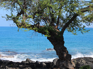 ハワイアン・カルチャーの保護と伝承に力を入れているのも、このリゾートの特徴です。ケアウホウ・ベイは、カメハメハ3世の生誕地で、とてもスピリチュアルな場所だといわれています。ホテルの敷地内にも古代ハワイアンの住居跡やカヌーをつないでいた場所、ソルト・パン(海水を天日にさらして塩を作った場所)、ヘイアウ(神殿)などの史跡があり、無料のカルチャー・ツアー(英語のみ)も行われています。また、地図をもらって、自分で回ることもできます。 とても清らかな雰囲気がする史跡周辺で、不思議なものにであいました。直方体の石「ベル・ロック」です。この石のある一点を叩くと、鐘(ベル)のような大きな音が遠くまで響き渡ったとか。その後ある人が、ベル・ロックが邪魔だからと海に流したらしいのですが、流しても、流しても、同じ場所に戻ってきたそうです。今じゃ、どこをどのような道具で叩くと大きな音がするのか、誰も知らないそうですが、なんともロマンを感じさせるお話ですよね。 もうひとつの不思議なものが、「メネフネの樹」です。メネフネとはハワイの伝説の小人のことで、身長は人間の半分くらい、土木工事に優れていたといわれています。メネフネといえばカウアイ島が有名ですが、ハワイ島にも様々な伝説が伝わっているそうです。シェラトン・コナ・リゾート内には、メネフネの樹とよばれる、なんとも不思議な木があります。こぶがいっぱいで、まるでおとぎばなしに出てくるような不思議な形の木の写真にメネフネの姿が写ったことがあるんだそうですよ! |