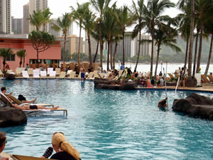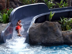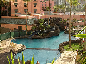 2008年12月30日(火)、ワイキキの中心部にある2軒のホテル「シェラトン・ワイキキ・リゾート」と「ザ・ロイヤル・ハワイアン」の間に、「ヘルモア・プレイグランド」と呼ばれるプールが完成、プール開きが行われました。 このプールは、シェラトン・ワイキキ・リゾートとザ・ロイヤル・ハワイアンの両方のホテルの宿泊客が利用することが出来ます。まるでネイバー・アイランドのリゾート地のようなゆったりとした作りのプールには、2つのプールとスリル満点のウォーター・スライダー、2つのジャグジーがあり、またプールの中にビーチチェアを設置して寛ぐことができるようになっています。ワイキキビーチを目の前に望む絶好の位置にあり、まさに「スーパー・プール」とでも言うべき豪華さなのです。プールの周りは、ハワイ土着の植物を中心に植えられた庭園となっており、ゆっくりと寛ぐことができます。 毎日午前11時から午後5時の間には、プールのそばにあるレストラン・バー「ラムファイヤー」のテラス部分で、ヘルシーなサラダやスープ、サンドイッチを楽しむことができますし、ビーチチェアからはボリュームタップリのプレートランチやシェイブアイス風のカクテルを注文することもできるとは嬉しいですね。 ヘルモア・プレイグランドは毎日午前9時から午後5時までのオープンです。スケールの大きなスーパー・プールで家族揃ってリラックスしてみませんか? |