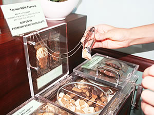 ■あなたのお好みのフレーバーは? お店の入り口付近には、他の店舗と同じくクッキーの試食コーナーとミネラル・ウォーターのタンクが設けられています。全てのフレーバーを気軽に味見して、気に入った味を見つけることができます。ロゴ付きの化粧箱に入ったクッキーのお値段は、フレーバーによって多少値段に差がありますが、9個入りで$5.95から$7.50、18個入りで$8.95から$11.50。シルバーの軽い箱詰めなら、10個入りが$6.50、20個入りが$9.95となっています。また、自分で好きな味を組み合わせてセットを作ることもできます。