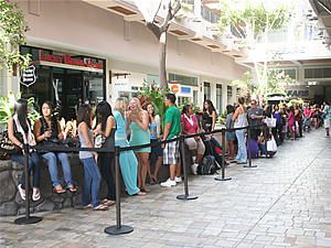 本日、10月1日(木)にアラモアナセンターのモールレベル2階にアメリカで爆発的人気のセクシーなランジェリー・ブランド、「ヴィクトリアズ・シークレット」がオープンしました。 午前8時すぎから始まった祈祷式には、スーパーモデルのマリサ・ミラーとホノルル市長の代理であるカーク・カルドウェル氏が出席。地元メディアの見守る中、司祭の祈祷が捧げられ、マリサ・ミラーがマイレ・レイをほどいて、正式に開店となりました。市長代理のカルドウェル氏はこのショップがハワイにもたらす経済効果に期待を示し、「世界的に有名なスーパーモデルと一緒に仕事ができるなんて」とセクシー美女とのツーショットという役得に思わずニッコリ。 これまで、ヴィクトリアズ・シークレットの商品は、ハワイ在住者にとって他州に行くか通販で手に入れることしかできなかったため、ハワイでの初店舗オープンということで、地元の女性たちの反応は熱狂的と言えるほど。店内から手を振るスーパーモデルのマリサ・ミラーのあまりの細さと美しさに待っている人たちからも感嘆の声が出ました。ショップの入り口付近には、午前8時くらいから行列が出来始め、午前9時半の開店と共に500人あまりの買い物客が店内に押し寄せました。