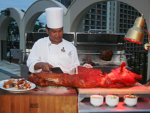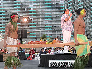 ヒルトン・ハワイアン・ビレッジ・ビーチ・リゾート&スパのルアウが生まれ変わりました。従来のルアウ、「ワイキキ・ラグーン・オン・ザ・ビーチ」に変わり、2009年2月23日(月)より駐車場ビルディング屋上のルーフトップ・ガーデンで、 「ワイキキ・スターライト・ルアウ」という名で、装いも新たに日曜日から木曜日までの5日間 開演されています。 ワイキキ・スターライト・ルアウは、会場の中央にセットされた大きなステージでティハティ・プロダクションズのダンサーたちが織り成す創造的なショーが繰り広げられます。タヒチの魅惑的なダンス「オヘア」、ニュージーランドのマオリ族の勇壮な踊り、ハワイのフラなど、太平洋各地の踊りが行われます。圧巻は最後の4人の男性による ファイアー・ナイフダンスで、ショーは最高に盛り上がります。 このルアウの料理は、伝統的なハワイアン料理と現代的な味が融合した独創的なもの。ビュッフェ形式でゆっくりと楽しむことができます。 ワイキキ・スターライト・ルアウは、日曜日から木曜日までの毎日5時半から8時半まで。大人1人$95、4-11才の子どもは1人$47.5。ステージのすぐ前の席は、$4の追加となります。問い合わせ、申し込みはホテル内のルアウデスク(808)941-8528、または各旅行代理店ラウンジ・デスクでどうぞ。 |