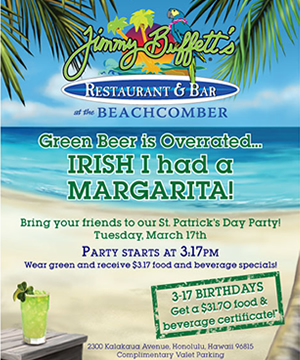 ■緑の洋服を着ていくと良い事が! 今年の2月2日(月)に、ワイキキのオハナ・ワイキキ・ビーチコマー・ホテル内にオープンした、ジミー・バフェット・レストランでも、セント・パトリック・デーを祝うパーティが行われます。3月17日に因んで、午後3時17分にパーティがスタート。3月17日が誕生日の人には、$31.70分のお食事と飲み物券がプレゼントされます。誕生日を証明するもの(パスポートなど)が必要となりますのでお忘れなく。また、緑色の洋服を着ている方には、$3.17分のお食事と飲み物券がプレゼントされます。緑の洋服を忘れないようにしましょう。 1階のカラカウア通り沿いには、ジミー・バフェットのオリジナル・ショップがオープン。ジミー・バフェットのCDや、Tシャツなどのアパレル類、オリジナル商品が勢ぞろい。お土産にしても喜ばれそうですね。また、ロビーの一角には「ホノルル・サーフィン博物館」もオープンし人気を呼んでいます。 |