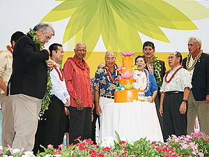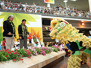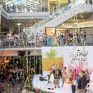 今から50年前、1959年8月13日にアラモアナセンターは産声をあげました。当時、アメリカ最大のショッピングセンターとして注目を集めていたアラモアナセンターは、50年後の今では広さも約2.5倍となり、世界最大規模のアウトドア型ショッピングセンターとして、ハワイ地元人々はもちろんのこと、世界中の旅行者に愛されています。 アラモアナセンターの創業記念日である8月13日(木)の午後5時30分より、同センターのセンターステージで、スペシャル・バースデー・セレブレーションが開催されました。オープン当初からある11軒のショップの経営者やスタッフが招かれ、伝統的なハワイアン・ブレッシングが行われました。アラモアナセンターのジェネラル・マネージャー、フランシス・コフラン氏の挨拶に続いて、和太鼓、チャイニーズ・ライオンダンスなどのパフォーマンスも繰り広げられ、センターステージの周りの1階から3階までを埋め尽くした観衆からは大きな拍手が送られました。その後、ハワイアン・ミュージックのベテラン兄弟デュオ、ブラザーズ・カジメロが登場。曲にあわせてフラが披露されました。最後にはブラザーズ・カジメロのリードで「ハッピー・バースデー」を皆で唱和。クラッカーが打ち鳴らされ、天井から大量の金色のリボンが降ってきて、セレブレーションはお開きとなりました。 オープン当初から続いて営業中の11軒は以下の通り:クラック・シード・センター、デイリー・クイーン、フードランド・スーパーマーケット、ロングス・ドラッグス、レインズ、シアーズ、白木屋、ザ・スリッパーハウス、テリトリアル・セービング・バンク、郵便局、ワタムルズ。