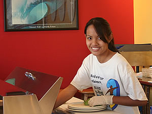 ワード・センター1階のこのお店は、カウンターで注文する方式。お店に入り、Order(オーダー=注文)と書いてある所で欲しいものを注文すると、お店の人がその場で作ってくれます。人気はずしりと大きなモンド・ブリトー($6.75)や、やや小振りのモンディート・ブリトー($5.75)。カウンターでは中に入れる具は何にするか聞かれますが、外から見えるので、欲しいものを指差せばOK!