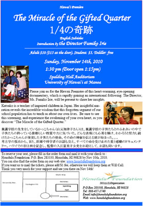 | ●「1/4の奇跡」ハワイ初上映 場所:ハワイ大学マノア校内スパルディング・ホール 上映日:11月14日(日)、13:30- チケット:$15(当日)、$10(前売り)、$5(学生)、幼児無料。 前売り券は、11月10日までに、お名前,ご連絡先(住所・メールアドレス・電話)と必要な入場券の枚数を明記し、小切手同封の上、Honolulu Foundation (Kiseki) P.O.Box 28330 Honolulu, HI 96828 まで。当日受付にて前売り券を受け取ることができます。 ウェブサイト(英語):www.honolulufoundation.org |